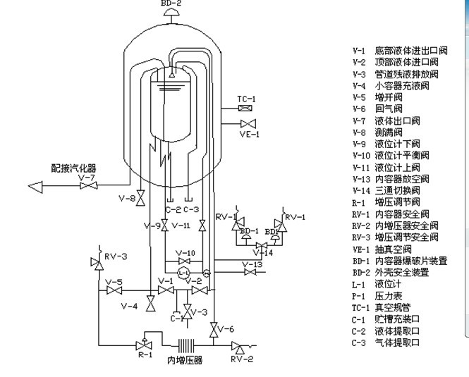 2.1.7在充灌液體期間,應(yīng)注意貯槽壓力表P-1。若貯槽內(nèi)容器壓力上升至超過供液壓力或接近貯槽的正常工作壓力,應(yīng)打開內(nèi)容器放空閥V-13,使貯槽放氣泄壓。